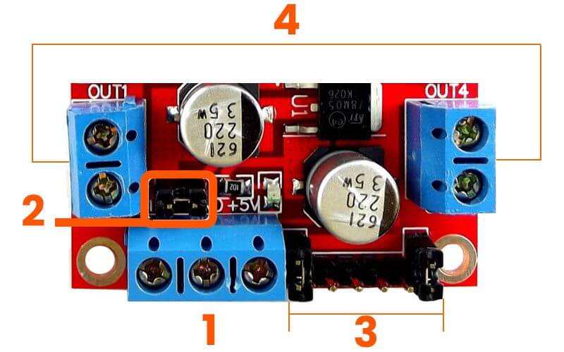 En otras palabras, con el Jumper de Control (2), el pin de 5V funciona como salida de 5V apoyando a la alimentación de alguna tarjeta de desarrollo. Sin el Jumper, el pin de 5V funciona como entrada, por lo cual se debe alimentar al modulo con 5V, para poder alimentar la lógica del modulo L298N