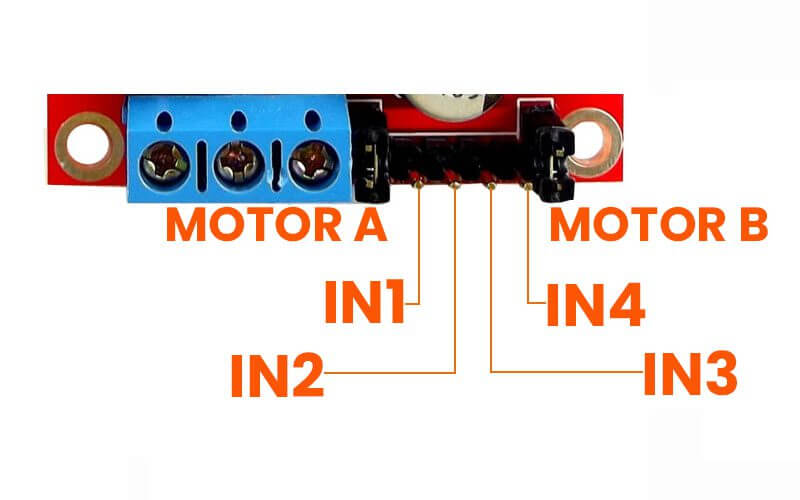 El módulo L298N se controla desde una bornera de 6 pines. Los pines IN1, IN2 corresponden a las entradas de la bornera del MOTOR A (OUT1 y OUT2). Mientras que IN3, IN4 permiten controlar las entradas de la bornera del MOTOR B (OUT3 y OUT4) respectivamente.